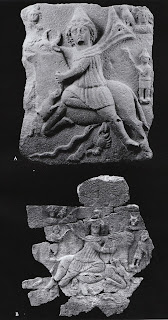 Seen in this plate are two basaltic sculptures of Mithras slaying the bull, a central ritual in this cult where the spilled blood renovates the fertility of the soil it irrigates. Both were found at or near Seeaa, a village in Soueida Governorate in Southern Syria and both date from the third century of the Common Era.